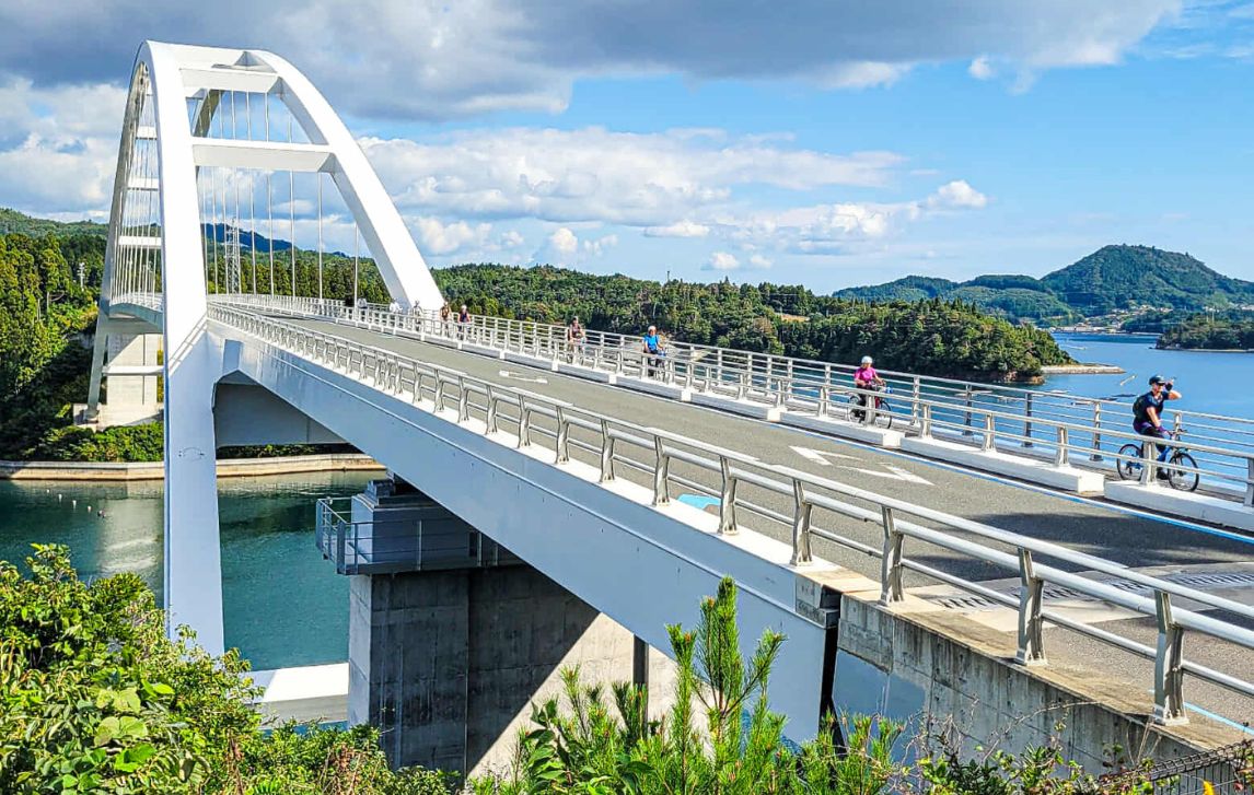 After the hike, we’ll hop back on our e-bikes for a scenic 13km ride into Rikuzentakata. This route winds through lush rice fields and rugged coastline and we’ll pass the midway point of the Michinoku Coastal Trail. As we near Rikuzentakata, we’ll cycle along the seawall, arriving at the Michi-no-eki rest stop and the Tsunami Memorial Museum. This museum is well worth a visit, offering a powerful and poignant look at the region’s resilience and recovery. Alternatively, you might prefer to take a break and grab an ice cream or coffee and stock up on snacks. A short stroll behind the museum leads us to the iconic Miracle Pine, a poignant symbol of hope and resilience in the region.